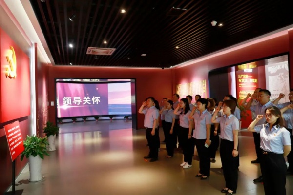 隨后,黨員們來到射陽縣黨性教育基地,該基地由重溫黨史、從嚴(yán)治黨、莊嚴(yán)宣誓三個展廳構(gòu)成。大家認(rèn)真聆聽講解員的講解,通過大量生動詳實(shí)的黨史視頻、圖片、文字資料、實(shí)物、情景模擬、典型案例等,使大家對黨的發(fā)展歷史、黨的反腐歷程、射陽人民奮斗史等方面有了更加深刻的理解和認(rèn)識。在莊嚴(yán)的宣誓大廳,鹽城東方集團(tuán)黨委委員、總會計師孫為軍帶領(lǐng)全體黨員,面向黨旗重溫入黨誓詞。“我志愿加入中國共產(chǎn)黨,擁護(hù)黨的綱領(lǐng),遵守黨的章程……”一句句莊嚴(yán)有力的誓言,表達(dá)了對黨忠誠,感黨恩、跟黨走的堅(jiān)定信念。