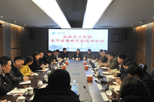 1月29日上午,鹽城東方集團在集團7樓會議室召開春節(jié)前廉政交流談話會議,區(qū)紀(jì)工委監(jiān)察工委第三紀(jì)檢監(jiān)察室主任張梅、科長葛峰出席會議并提出相關(guān)要求。集團各部門、子公司負(fù)責(zé)人參加會議。