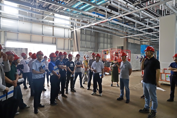 在總承包中鐵建工集團建筑安裝有限公司的現(xiàn)場負責人的引導下,東方集團一行人參觀學習了該項目的電極棟、組裝棟、活性棟等主生產(chǎn)廠房以及其他輔助用房。項目負責人就各觀摩區(qū)域的亮點向觀摩人員作一一介紹,該工程的建筑形式為鋼結構建筑,以電極棟一層為例,天花板上部共有21個系統(tǒng)機電管線,管線布置及其復雜,為了解決管線碰撞問題,項目指揮部開展BIM管線綜合深化設計。項目部合理整潔衛(wèi)生的施工場地、醒目的標語標識牌、規(guī)范的施工工藝、文明安全的施工氛圍,給前來觀摩的人員留下深刻的印象。