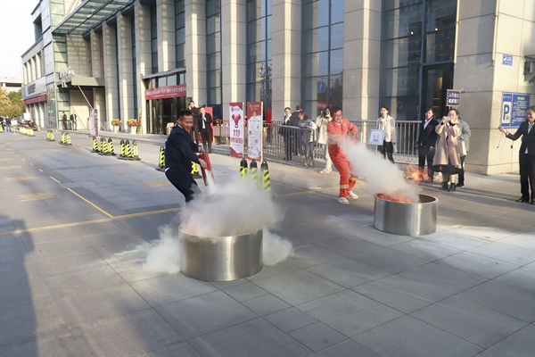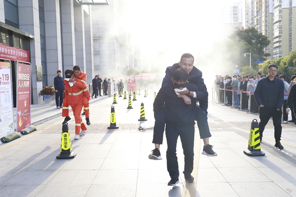 15:00分,隨著集團大樓火警鈴聲的響起,集團各部門、子公司人員在物業(yè)客服人員的引導(dǎo)下,口捂濕毛巾從各樓層安全通道低聲有序撤離至亞朵酒店門前廣場,參加本次宣傳日專題活動。