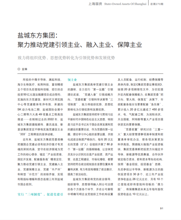 近日,《上海國資》雜志再次聚焦東方集團(tuán),通過在2023年第3期“國企黨建研究”專欄發(fā)表題為“鹽城東方集團(tuán):聚力推動(dòng)黨建引領(lǐng)主業(yè)、融入主業(yè)、保障主業(yè)”調(diào)研文章,深度報(bào)道了東方集團(tuán)通過大力實(shí)施黨建促主業(yè)“333”工程,推動(dòng)黨建工作與經(jīng)營發(fā)展深度融合,把黨建優(yōu)勢(shì)轉(zhuǎn)化為企業(yè)高質(zhì)量發(fā)展的制勝優(yōu)勢(shì),為奮力實(shí)現(xiàn)勇當(dāng)國企高質(zhì)量轉(zhuǎn)型發(fā)展標(biāo)桿目標(biāo)奠定了堅(jiān)實(shí)的基礎(chǔ)。
