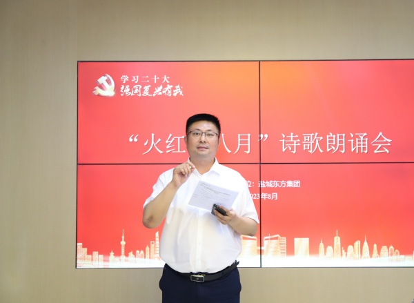 8月3日上午,鹽城東方集團黨委在東方黨建館舉辦了“強國復興有我”經典詩歌朗誦會。集團黨委委員、副總經理吳將出席活動,集團40余名黨員及干部職工參加此次活動。