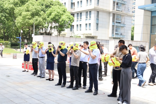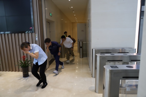 隨著大樓內(nèi)消防警鈴和廣播聲的響起,集團(tuán)各樓層人員在物業(yè)工作人員的指引下,通過兩處應(yīng)急通道樓梯,迅速有序疏散到了集團(tuán)一樓廣場(chǎng)。