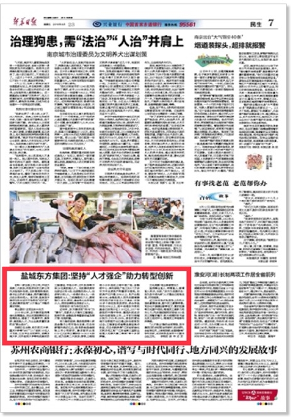 8月23日,《新華日?qǐng)?bào)》A7版再度聚焦鹽城東方集團(tuán),以《鹽城東方集團(tuán):堅(jiān)持人才強(qiáng)企 助力轉(zhuǎn)型創(chuàng)新》為題,重點(diǎn)介紹了東方集團(tuán)在人才創(chuàng)新驅(qū)動(dòng)方面的做法。