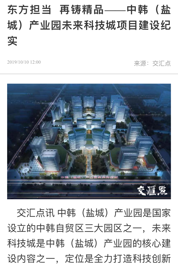 中韓(鹽城)產業(yè)園是國家設立的中韓自貿區(qū)三大園區(qū)之一,未來科技城是中韓(鹽城)產業(yè)園的核心建設內容之一,定位是全力打造科技創(chuàng)新核心區(qū)、活力雙創(chuàng)區(qū)、總部研發(fā)區(qū)、商務政務區(qū)、高端配套區(qū),計劃建設開放時間為2020年6月底。面臨責任重、要求高、時間緊的政治任務,曾經打造過國際會展中心、北師大鹽城附校等精品工程,創(chuàng)下東方速度、東方奇跡的鹽城東方集團清醒的意識到,高點起跳、高速躍進,沒有一股子闖勁不行!