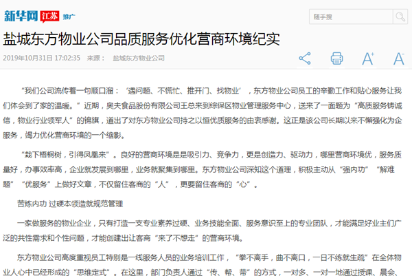 作為企業(yè)的“管家”,物業(yè)的管理水平和服務理念直接影響著客商的幸福指數(shù)。東方物業(yè)經(jīng)過10多年的發(fā)展,不斷尋求無微不至的品質(zhì)服務,用心為客商打造更美好的生活方式,實現(xiàn)跨越式發(fā)展。
