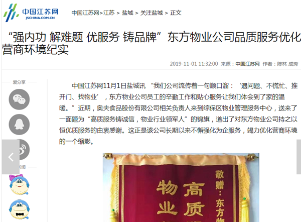 “我們公司流傳著一句順口溜:‘遇問題、不慌忙、推開門、找物業(yè)’,東方物業(yè)公司員工的辛勤工作和貼心服務讓我們體會到了家的溫暖。”近期,奧夫食品股份有限公司王總來到綜保區(qū)物業(yè)管理服務中心,送來了一面題為“高質(zhì)服務鑄誠信,物業(yè)行業(yè)領(lǐng)軍人”的錦旗,道出了對東方物業(yè)公司持之以恒優(yōu)質(zhì)服務的由衷感謝。這正是該公司長期以來不懈強化為企服務,竭力優(yōu)化營商環(huán)境的一個縮影。