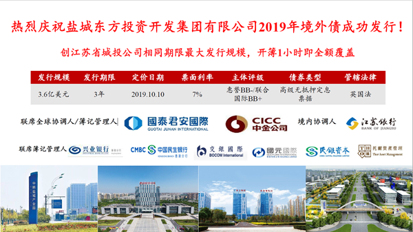 近日,從香港國泰君安交易大廳傳來喜訊,鹽城東方集團(tuán)2019年度3年期3.6億美元境外債在香港成功發(fā)行,成為全省同類型、同期間最大規(guī)模的境外債發(fā)行項(xiàng)目。