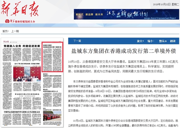 10月22日,《新華日報(bào)》第11版顯著位置報(bào)道鹽城東方集團(tuán)成功發(fā)行第二單境外債,慶祝鹽城東方集團(tuán)近日在香港成功發(fā)行的2019年度3年期3.6億美元境外債,成為全省同類型、同期間最大規(guī)模的境外債發(fā)行項(xiàng)目。
