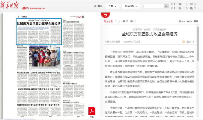 4月3日,《新華日?qǐng)?bào)》第8版“一線視點(diǎn)”頭條,以《打造國(guó)際“會(huì)客廳” 實(shí)現(xiàn)近悅遠(yuǎn)來(lái)——鹽城東方集團(tuán)致力攻堅(jiān)會(huì)展經(jīng)濟(jì)》為題,聚焦鹽城東方集團(tuán)發(fā)力“會(huì)展經(jīng)濟(jì)”賽道,依托區(qū)位優(yōu)勢(shì)、優(yōu)質(zhì)載體、卓越團(tuán)隊(duì)、品牌服務(wù),致力打造區(qū)域經(jīng)濟(jì)發(fā)展強(qiáng)引擎的生動(dòng)實(shí)踐。